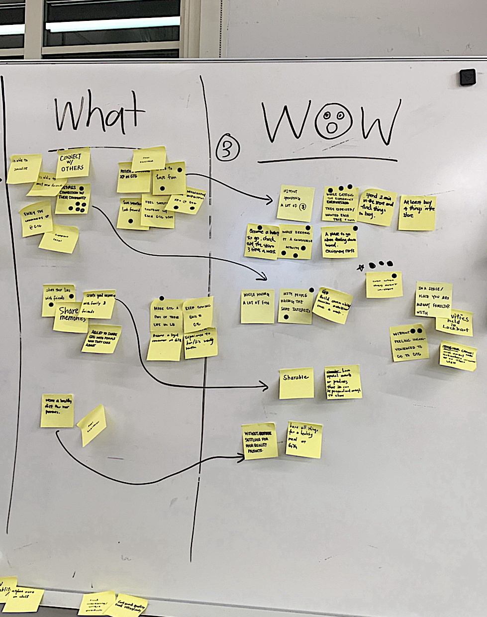 Since we only focused on our primary solution, I would also hope to be able to work through and implement our secondary solutions that are fun, creative, and low-risk to generate some buzz and excitement where customers are more involved and can lead to increased interest in GTG’s shopping experience and products they sell. Some of these ideas include a treasure map with novelty items promoted and described, a sample box of uniquely curated items customers can order and test out, and a bulletin board with local brands/producers GTG partners with mapped out to create a sense of community—all of which we explored in our ideation phase.