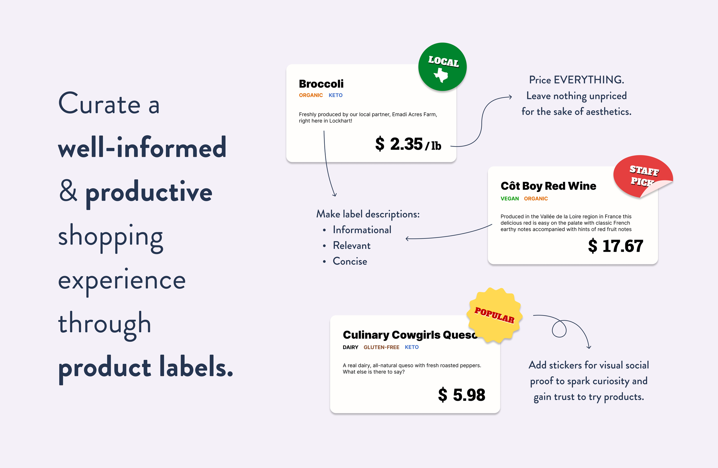 After we were led to our solution through research and ideation, I designed 3 product labels from products found at GTG that provided our stakeholders with a clear guide to create their own product labels.