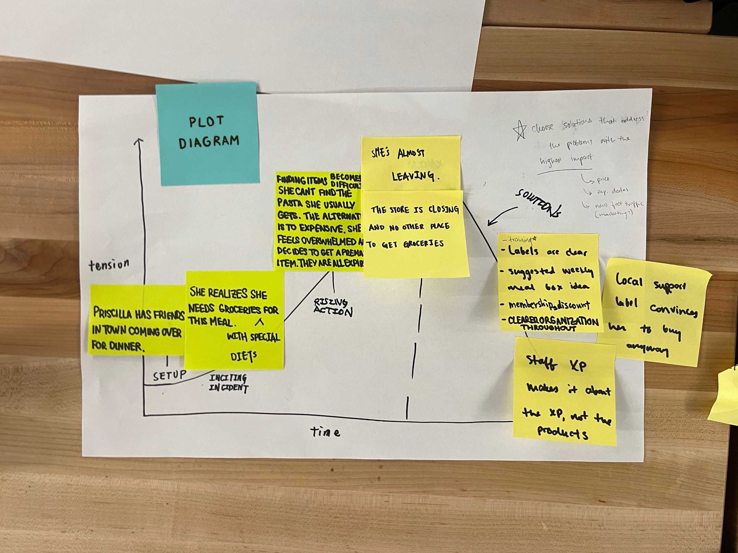 We made a plot diagram with an example scenario that helped us visualize Priscilla’s user journey based on points such as the exposition, rising action, climax, falling action, and resolution. It helped make it obvious that we had to choose solutions that addressed the problems with the highest impact.