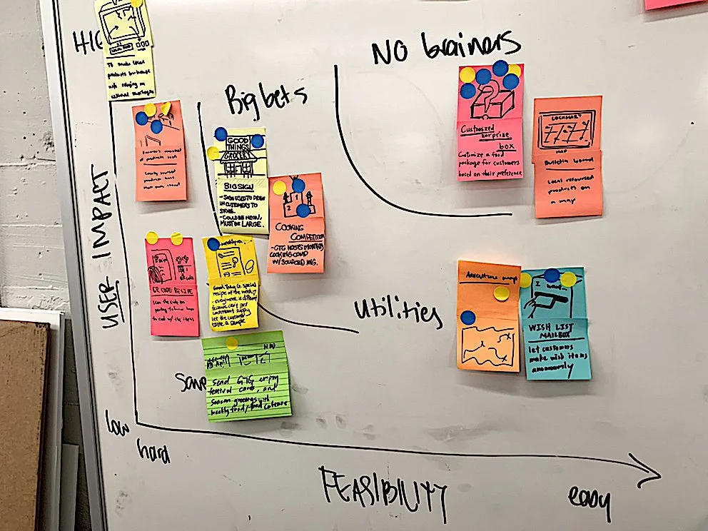 In another round of ideation, we conducted a design sprint method of ideation called Crazy 8’s for rapid idea generation hoping to generate some more out-of-the-box ideas that we might be able to implement. At the end of the session, we came back together to share our ideas with each other and vote on the ones we liked the most. We then clustered ideas together by theme to get a bigger picture of the variety of them. We created a prioritization grid to narrow down what we thought were potentially viable solutions.